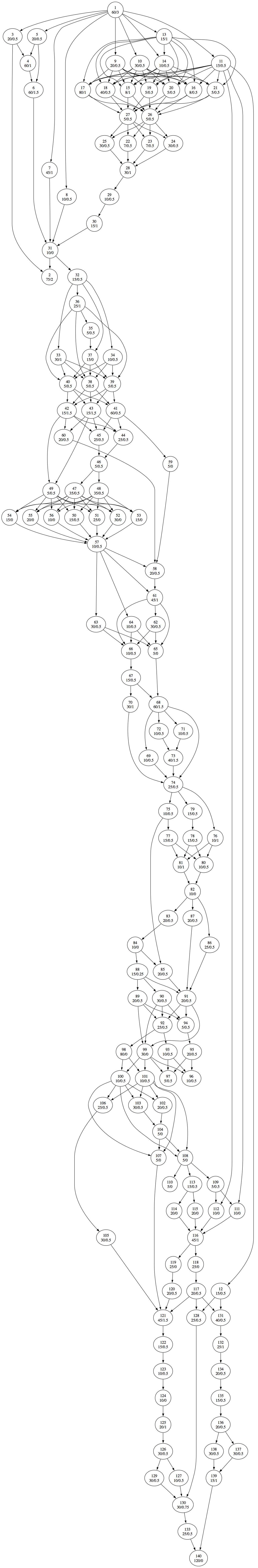 Graph NISSAN-01. Every vertex (task) has an associated tuple representing number (j), duration (t) and required area (a) of the task.